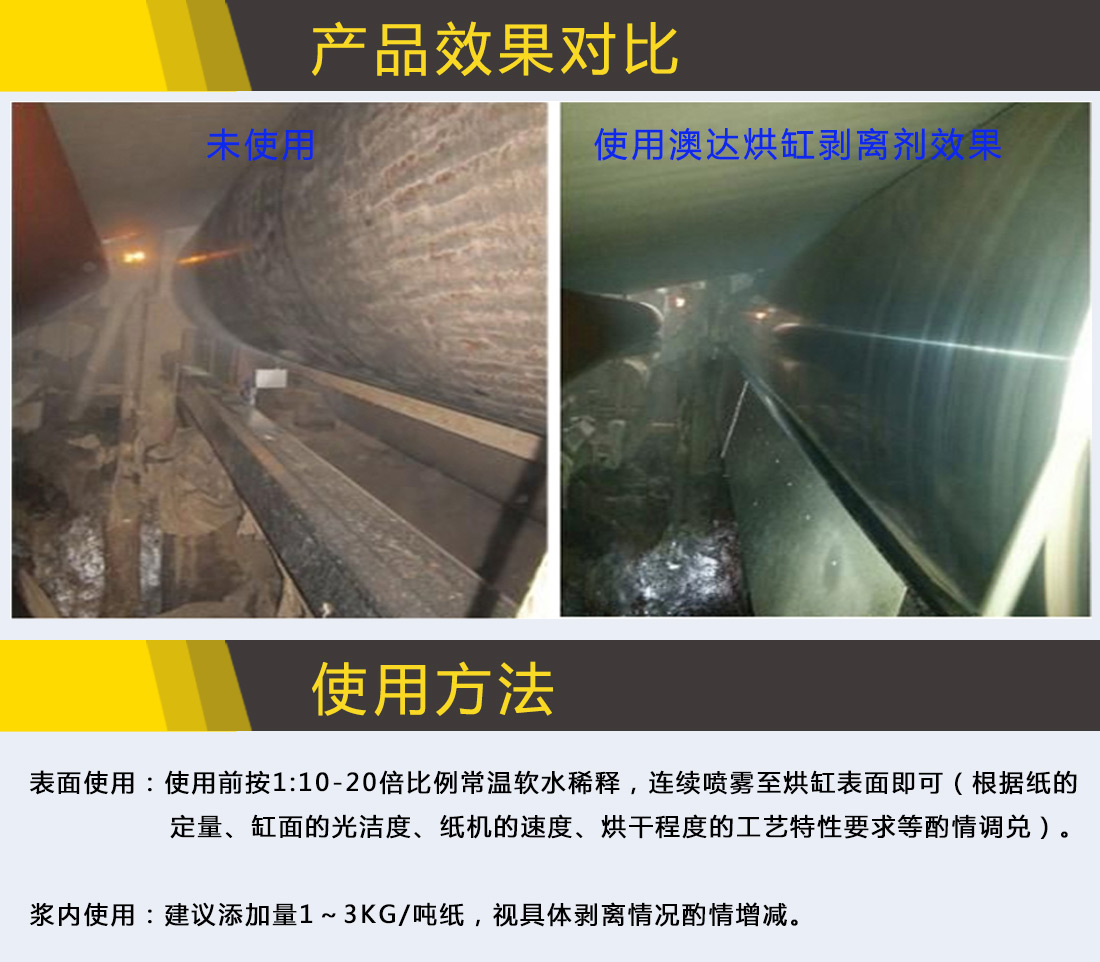 1、有效改善各種紙在生產中粘缸和掉紙粉等現(xiàn)象; 2、提高紙纖維柔軟性、平滑性,使紙幅與烘缸表面的摩擦減少、賦予紙品特殊的光亮性、紙頁無油斑; 3、不僅解決粘缸現(xiàn)象,而且還保持干網(wǎng)的清潔; 4、任意比例水稀釋不分層、不破乳、分散性好,不堵噴頭; 5、因為非離子性,與其它化學品配伍性好; 6、用量少、操作方便、剝離效果好。
